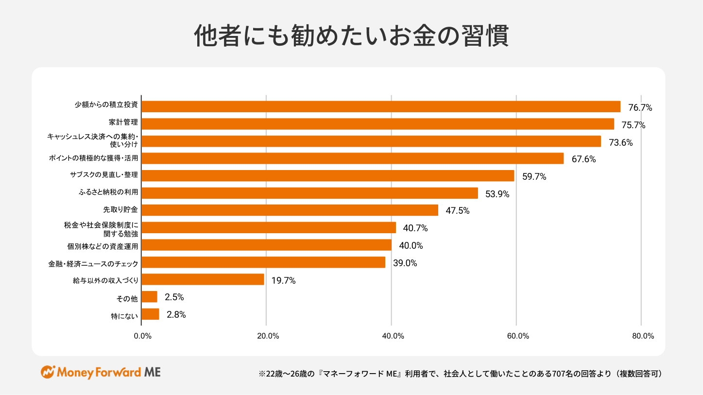 他者にも勧めたいと思うお金の習慣として、1位「少額からの積立投資(NISA、投資信託など)(76.7%)」、2位「家計管理(支出や資産の可視化)(75.7%)」、3位「キャッシュレス決済への集約・使い分け(73.6%)」が上位に挙がりました。4位には「ポイントの積極的な獲得・活用(ポイ活)(67.6%)」、5位に「サブスクの見直し・整理(59.7%)」と結果が続き、日々の家計管理と、将来に向けた資産形成に寄与する習慣が伺えます。