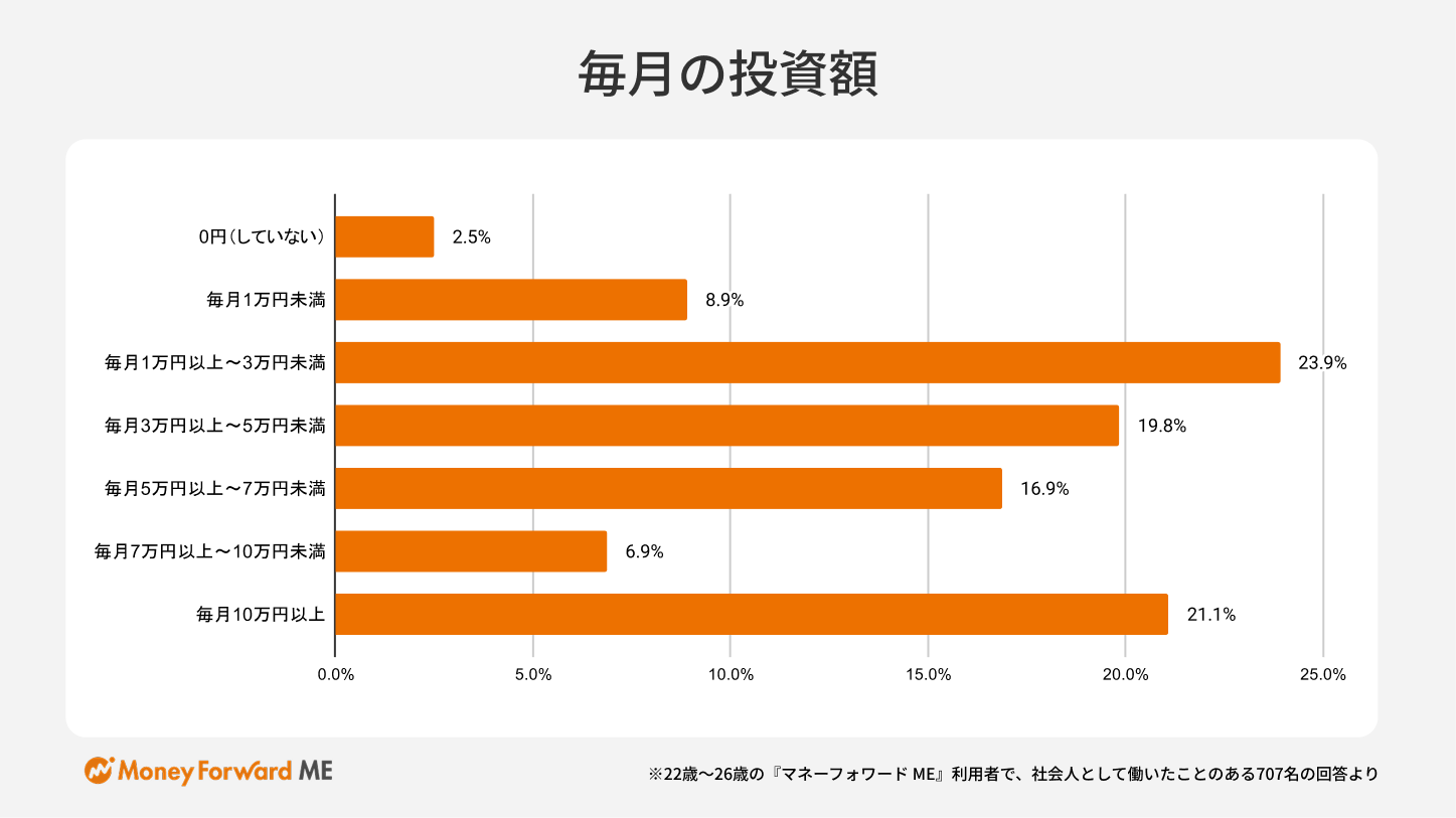 毎月の投資額については、「毎月1万円以上~3万円未満(23.9%)」が最も多く、毎月の貯蓄額についても、「毎月1万円以上~3万円未満(30.7%)」が最も高い割合となりました。社会人としての働きはじめとともに、無理のない金額から投資や貯蓄を継続しようとする姿勢が見えてきます。
