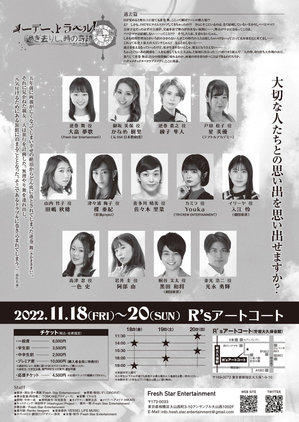 Fresh Star Entertainment(代表:新鮮誠)主催、『メーデー、トラベル!-過去編-過ぎ去りし、時の奇跡』が2022年11月18日 (金) ~2022年11月20日 (日)にR’s アートコート(東京都新宿区大久保1丁目9-10 労音大久保会館)にて上演されます。