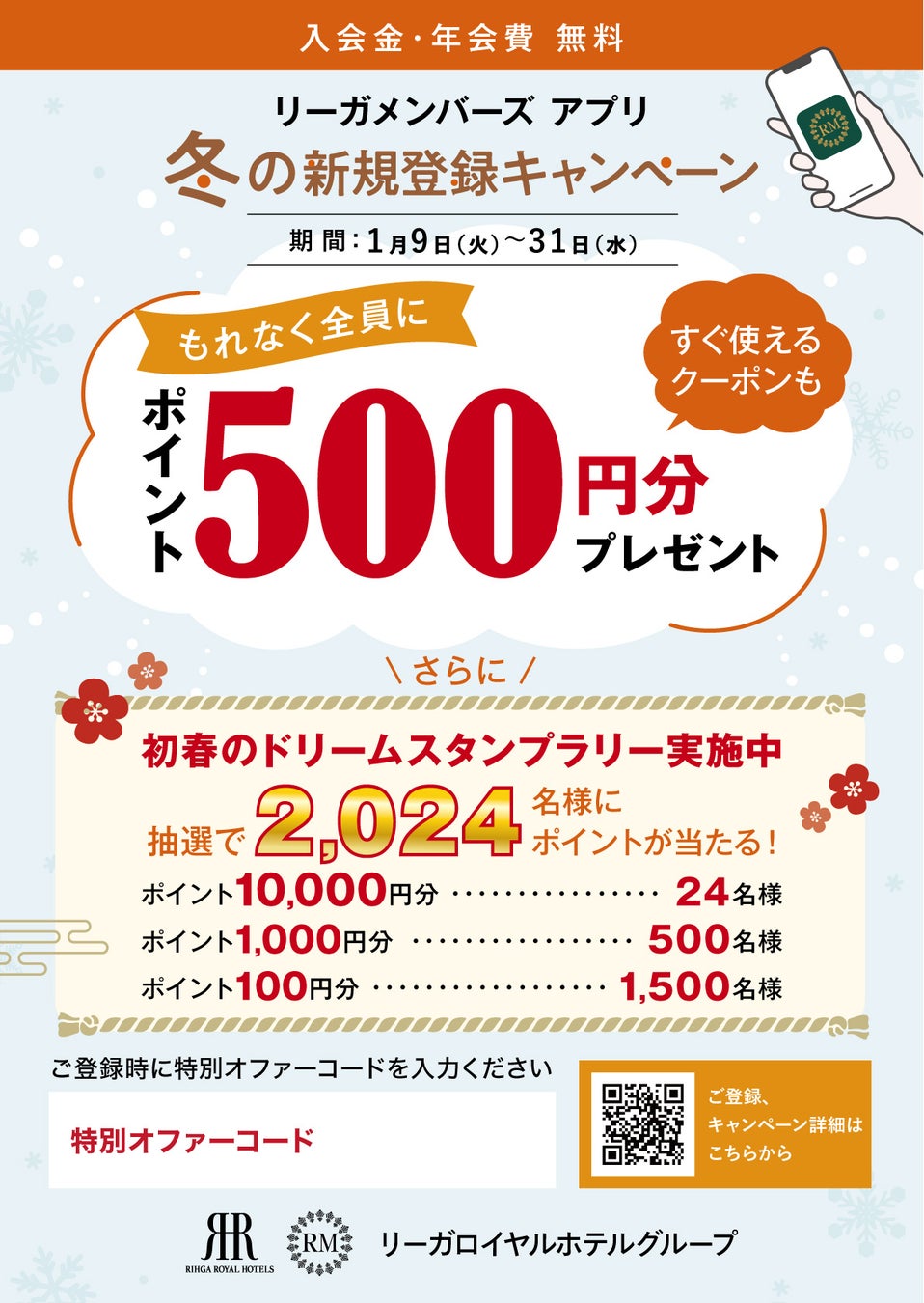 全国にリーガロイヤルホテルグループ&アソシエイトホテルズを展開する株式会社ロイヤルホテル(大阪市北区中之島、代表取締役社長 植田 文一)は、会員サービス「リーガメンバーズ」のスマートフォン向けアプリにおいて、1月9日(火)から1月31日(水)まで、 今すぐ使えるポイント500円分をプレゼントする新規登録キャンペーンを実施します。また、新たに会員登録された方全員に、レストラン飲食代10~20%割引など、すぐに使えるお得なクーポンをプレゼントします。さらに、1月9日(火)から3月20日(水)まで、全ての会員を対象に、ホテルのご利用でスタンプを貯めると抽選で2024名様にポイント最大1万円分が当たる「初春のドリームスタンプラリー2024」を開催します。