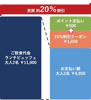 「リーガメンバーズ」 新規登録キャンペーンでは、例えば、リーガロイヤルホテル(大阪)のレストランをご利用の場合、新規ご登録により獲得されたポイントのご使用でお会計から500円割引となり、さらに、15%割引クーポン※も併用可能です。(※クーポンの内容はホテルにより異なります。一部、割引対象外あり) ポイントはご宿泊代※にもご使用いただけます。(※一部対象外あり)