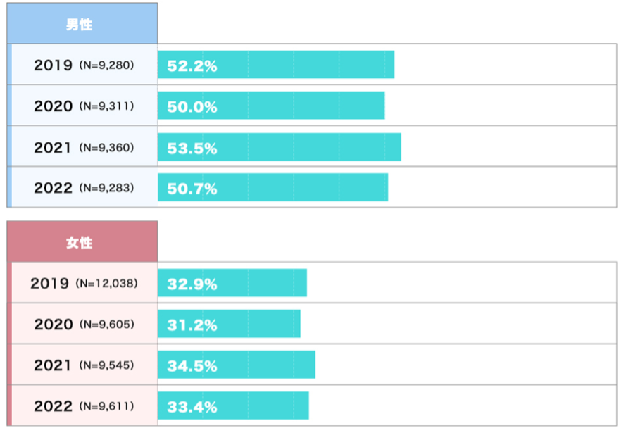 本調査において「独立・開業に興味がある」と回答したのは41.9%(前年比2.0pt減)で、前年より減少した。割合は男女ともに低下し、男性は50.7%(前年比2.8pt減)、女性は33.4%(前年比1.1pt減)だった。【図1、2】