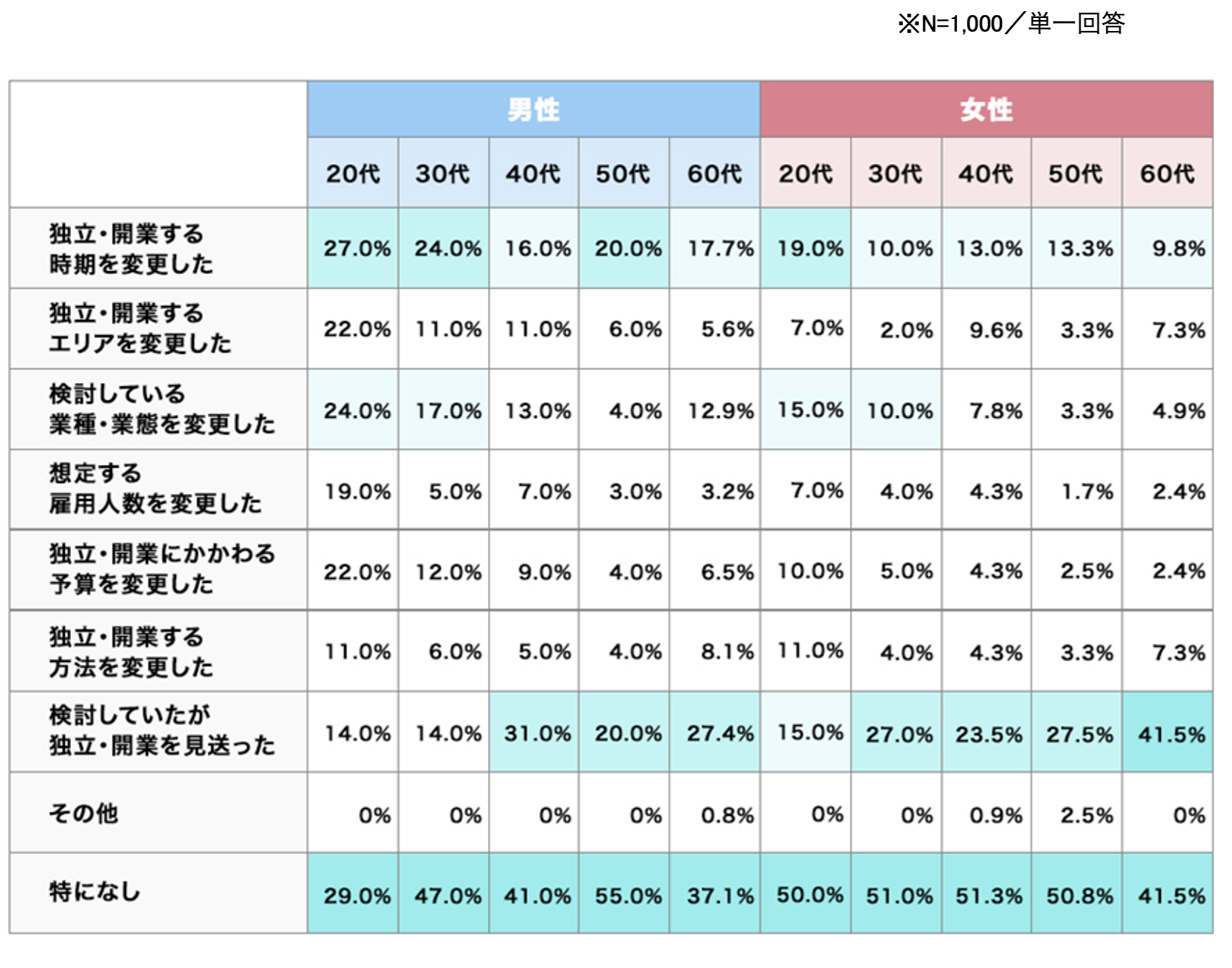 時勢(コロナウイルスの流行による影響を含む)の変化が独立・開業の検討に影響したことについては、前年同様にすべての年代で「特になし」という回答が最も多かった。その一方で「検討していたが独立・開業を見送った」という回答も、20代・30代男性、20代女性を除く年代で20%を超えた。20代・30代は、時勢の影響を受けずに独立・開業を検討している傾向が見られた。【図6】