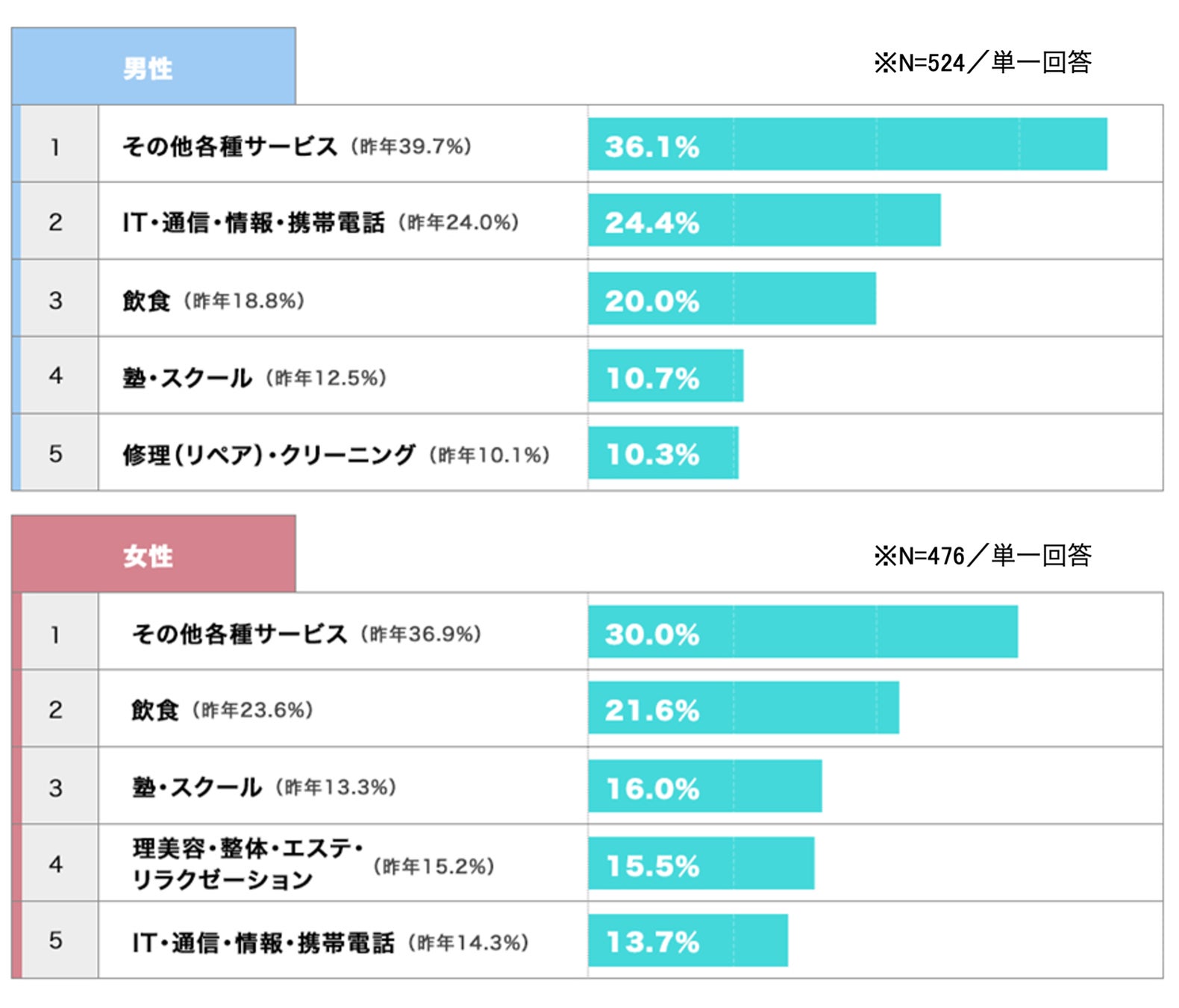 興味のある業種は「その他各種サービス」の割合が男女ともに最も高く、男性は36.1%、女性は30.0%を占めた。女性では「塾・スクール」が16.0%(前年比2.7pt増)に上昇し3位にランクインした。【図5】