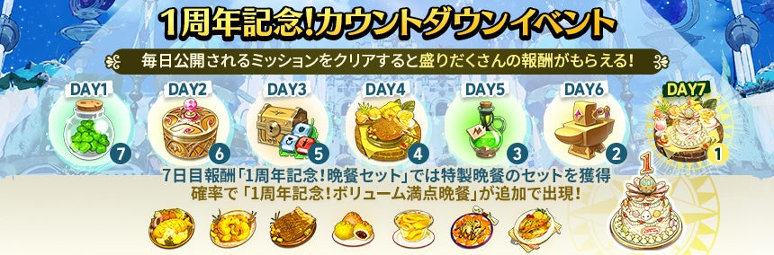 イベント期間中に毎日出題されるサプライズミッションをクリアすることで、「1周年記念!晩餐セット」の他、高級修理台やエナジードリンク、プレミアム装飾品ボックスなどの様々な報酬を獲得できます。