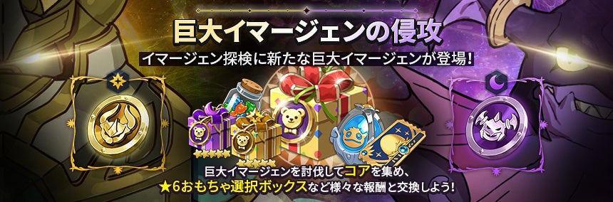 イベント期間中は「イマージェン探検」に、光属性の「ゴーリオン」と闇属性の「オキシドン」2体の巨大イマージェンが出現いたします。巨大イマージェンとの戦闘では進行したフェーズに応じて「巨大イマージェンコア」を獲得できます。獲得したコアは、イマージェン召喚チケットや各属性専用のおもちゃ選択ボックスなど、様々なアイテムと交換することができます。