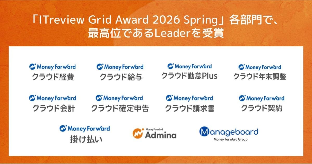 マネーフォワードグループが提供する11プロダクトが、アイティクラウド株式会社主催「ITreview Grid Award 2026 Spring」の各部門にて、最高位である「Leader」を受賞しました。今回受賞したプロダクトは、株式会社マネーフォワードのバックオフィスSaaS『マネーフォワード クラウド』の8プロダクト、マネーフォワードケッサイ株式会社の企業間後払い決済・請求代行サービス『マネーフォワード 掛け払い』、マネーフォワードi株式会社の情シス向け業務OS『マネーフォワード Admina』、マネーフォワードコンサルティング株式会社の経営管理プラットフォーム『Manageboard』です。