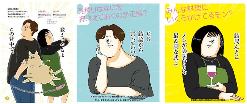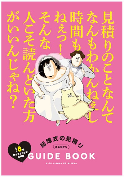 今回の付録「結婚式の見積りGUIDE BOOK」では、漫画家・地獄のミサワさんと初コラボ。結婚式に詳しいという設定のオリジナルキャラクター「大型服 着男(ビッグシルエットシャツ きるお)」と「YUKA姉」、「ねこ犬」が結婚のお金に関するカップルの悩みについて解説しながら名言(迷言!?)を披露します。脱力系の独特の世界観にくすっとしてしまうこと必至! 読み終える頃には、分からないことも多い結婚式のお金に関する疑問も自然と解決してしまうはず。完全オリジナルの描き下ろしで送る地獄のミサワさんとのコラボ別冊にぜひご注目ください。