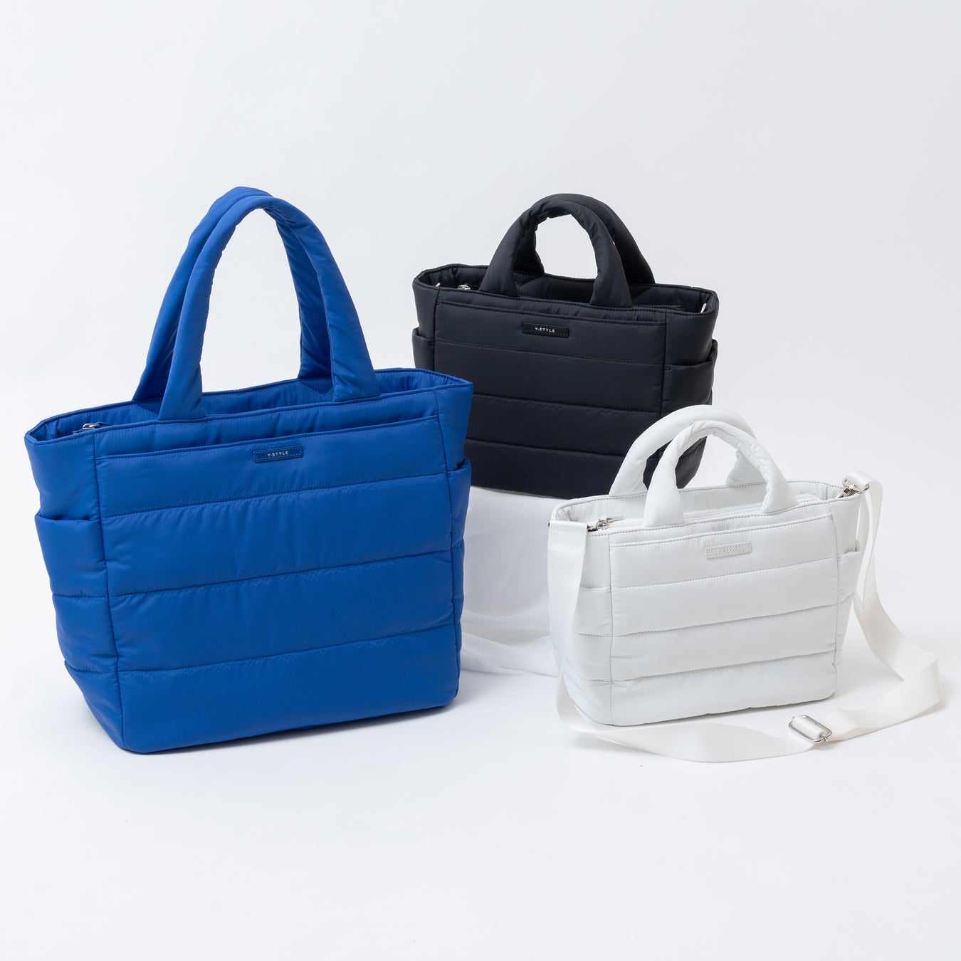 可愛いダウンのような収納トートバッグ。軽くて大容量です。(L)18ポケット/(S)16ポケットで、探し物の悩みが解消します!また、大きめの雑誌も入るサイドポケット(L)。種類豊富な収納ポケットで、普段使いはもちろん、旅行等にもぴったりです。男女兼用でマザーズバッグとしても使えます。