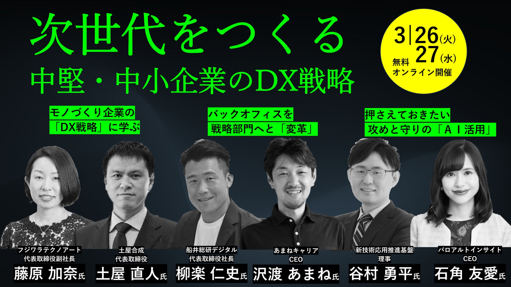 デジタル技術を活用し事業成長を実現している中小企業経営者に加え、バックオフィス(間接部門)改革やAI活用の専門家を招き、業務効率化や生産性向上、人材育成、事業創出など次世代をつくる「DX戦略」について考えます。