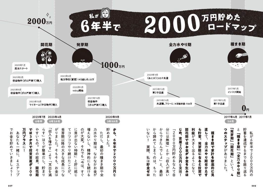 種まき期、全力水やり期、発芽期、開花期の4つのステップで、2000万円貯まる!