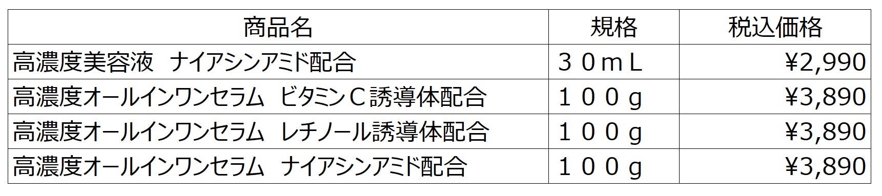 また、「高濃度美容液」は、今年6月に発売したビタミンC誘導体配合、レチノール(※3)誘導体配合、セラミド配合の3種に加え、新たに「高濃度美容液 ナイアシンアミド配合」が加わります。乾燥によるくすみが気になる肌にうるおいを与え、ハリと透明感のある肌に導く、ナイアシンアミドを10%配合した美容液です。「高濃度オールインワンセラム」との併用も可能です。