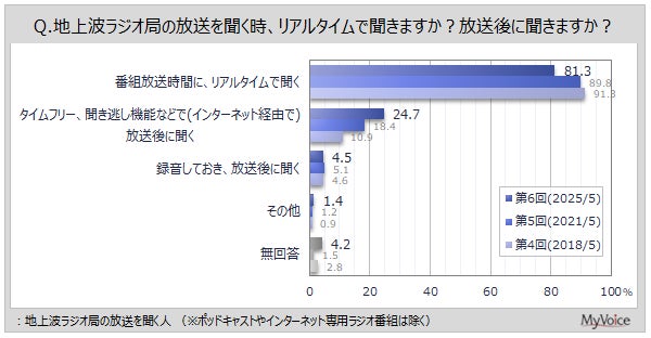 【ラジオに関する調査】地上波ラジオ放送を聞く人のうち、放送後にタイムフリー・聞き逃し機能などで聞く人が約25%。過去調査と比べて増加傾向