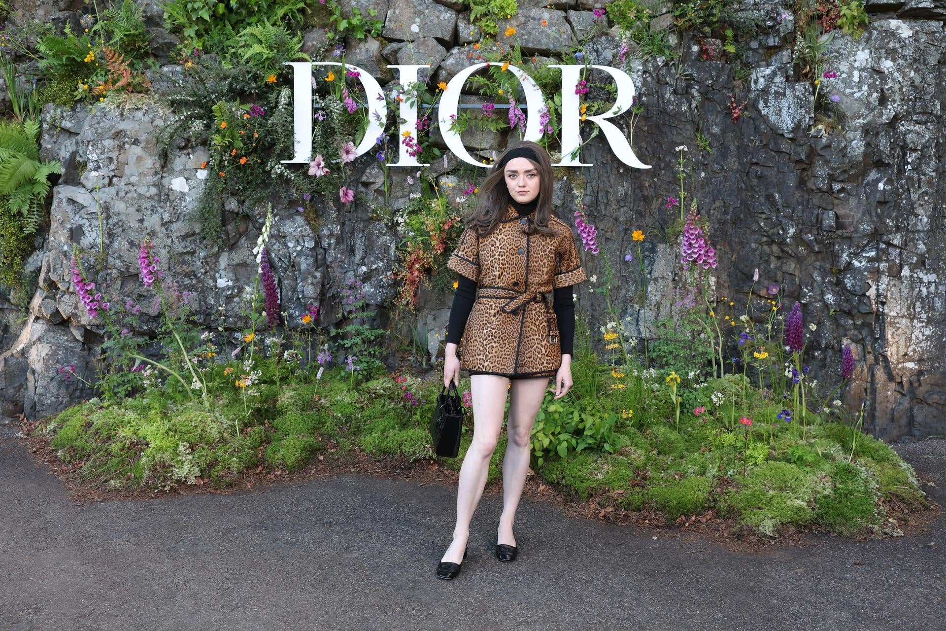 メイジー・ウィリアムズは2024-2025年ウィンター コレクションより、プリントのウールジャケットとショートパンツ、ブラックのカシミアタートルネックに、バッグとシューズを合わせました。