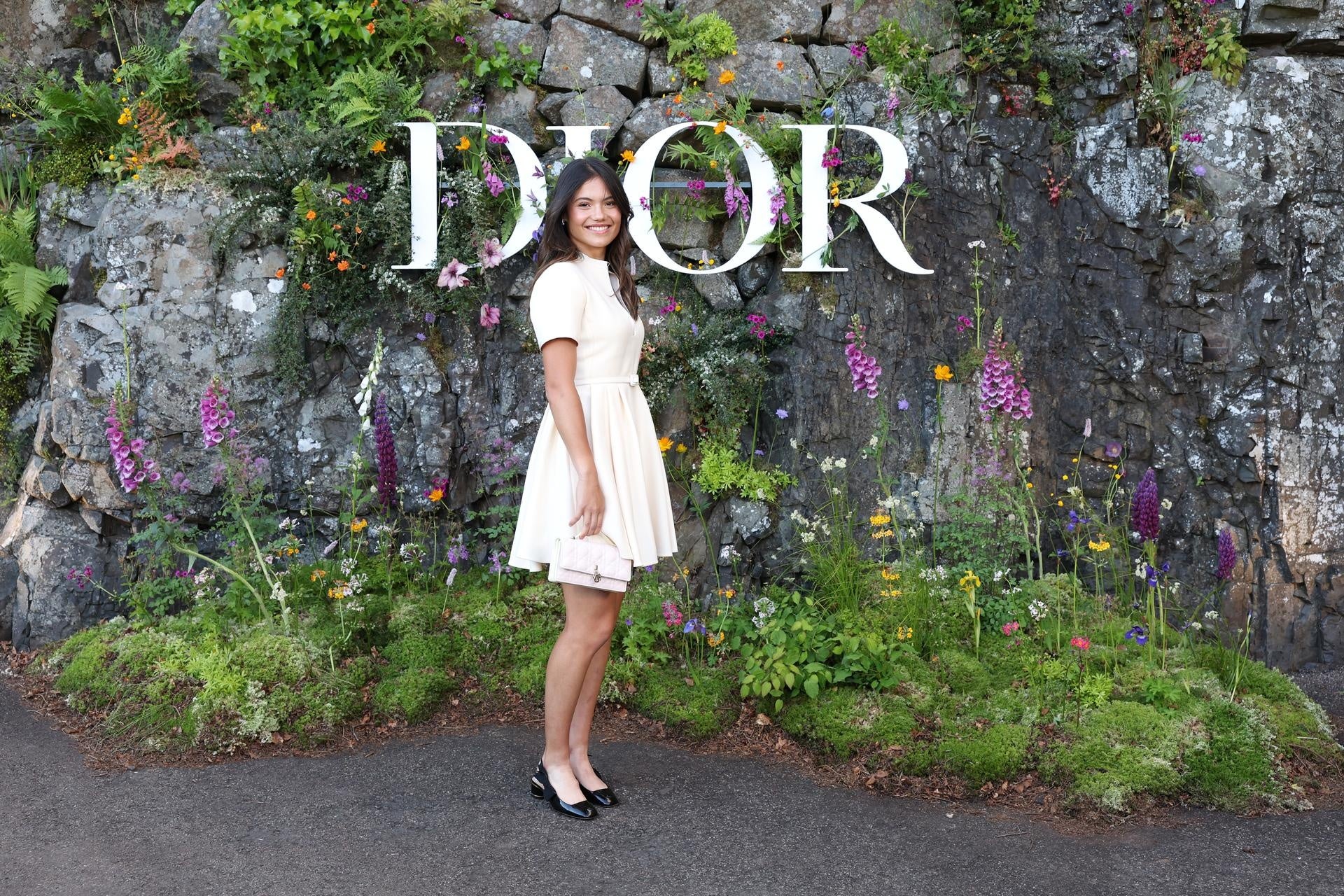 イギリスのテニス選手、エマ・ラドゥカヌはホワイトのウール&シルクのドレスに、ディオールのバッグとパンプスを合わせた装いを披露しました。