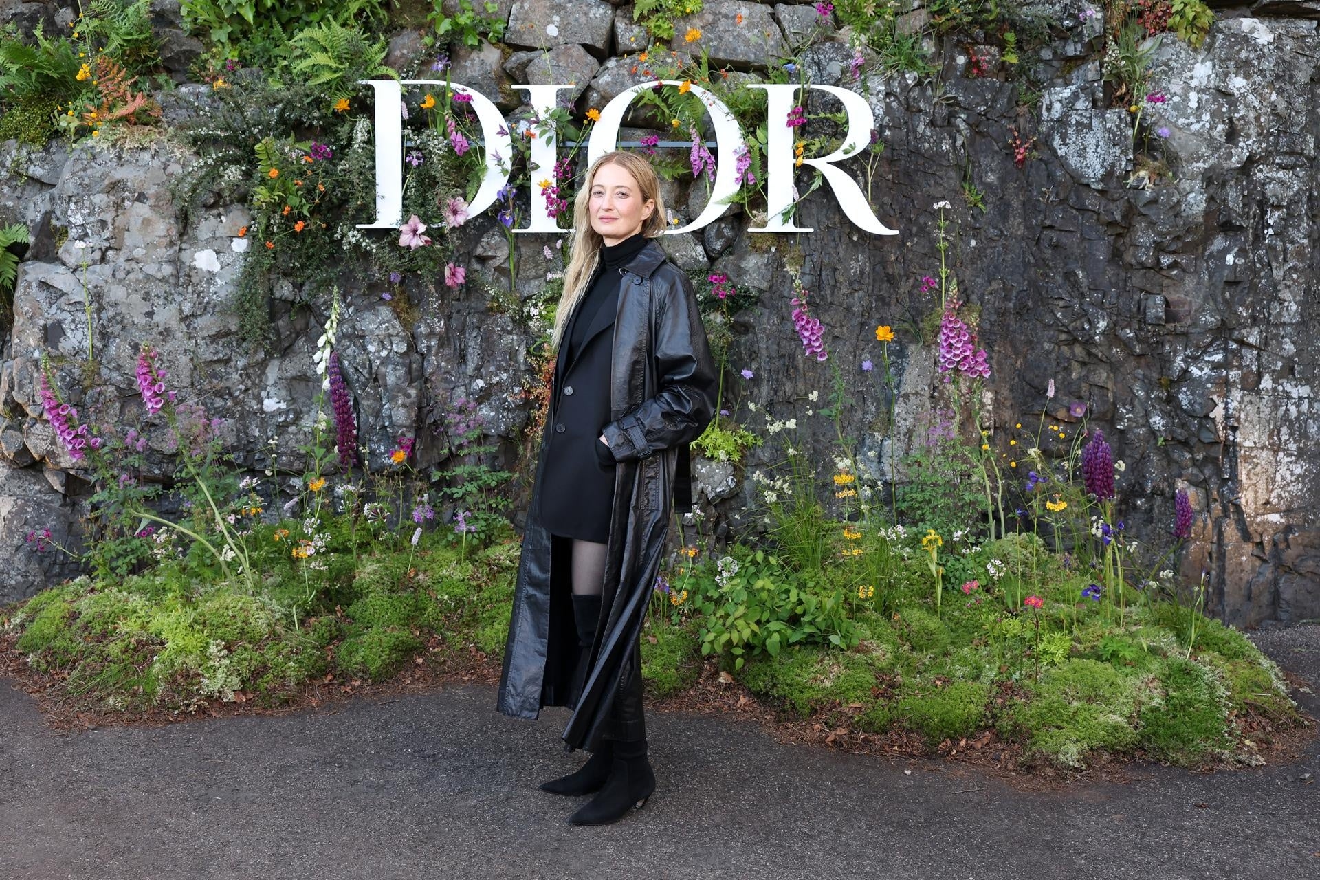 アルバ・ロルヴァルケルは、黒のカシミアタートルネックと黒のウールドレスの上に、2024-2025年秋冬 コレクションのブラックレザートレンチコートを纏い、ディオールのブーツを着用しました。