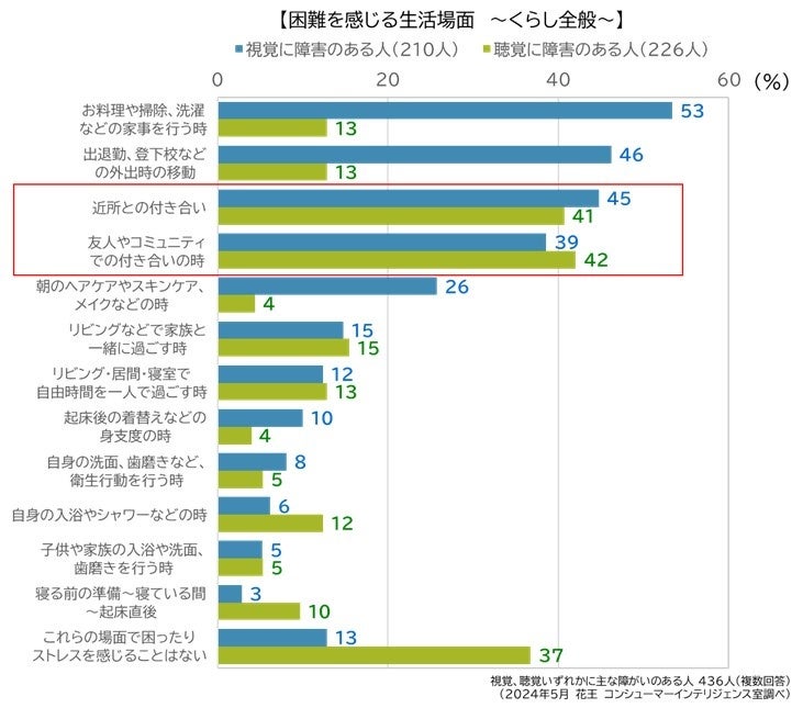 視覚や聴覚に障害のある436人が生活の中で「見えにくさ」「聞こえにくさ」によって困難を感じる場面は、家事や移動など様々です。視覚・聴覚どちらにも共通していたのは、ご近所や友人との人付き合いでの場面でした。