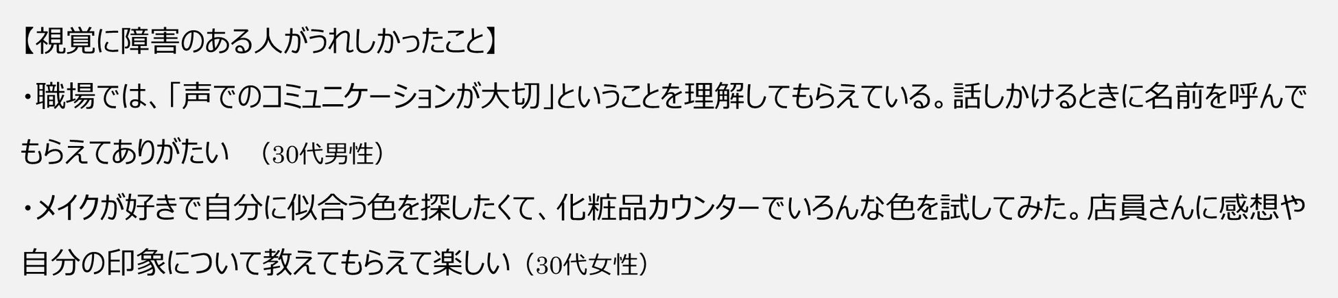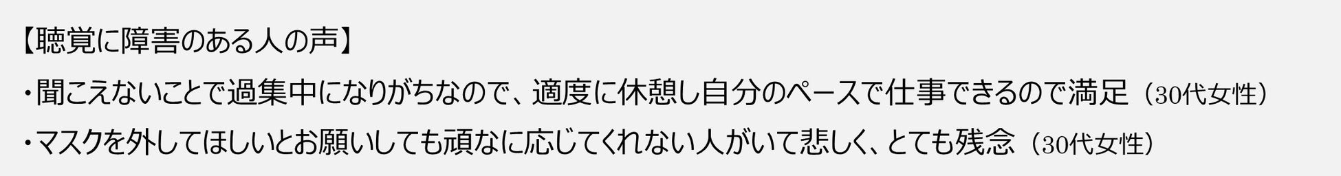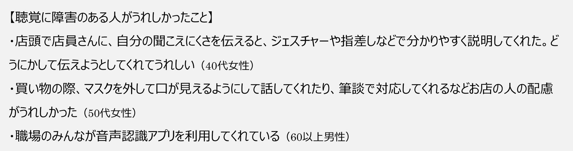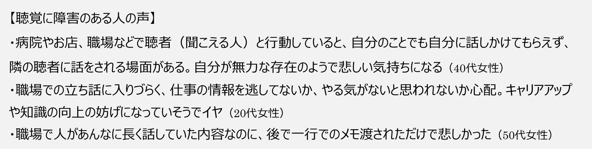 今回の障害がある人への調査から浮かび上がってきたのは、周囲の理解不足や無意識の思い込みによって生じる課題でした。それによって障害のある人が、思っていることが伝わらないつらさやジレンマを感じていることがわかります。