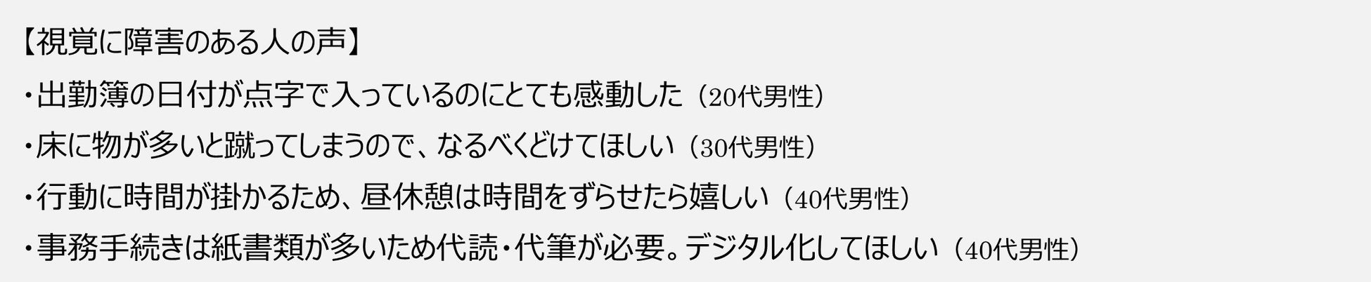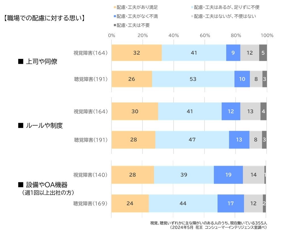 視覚や聴覚に障害がある人のうち働いている人が、職場の配慮やルール・制度などに満足しているのは3割前後、4割は何らかの不便を感じ、1~2割は不満を感じていることが分かりました。