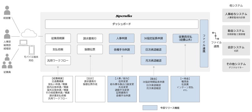 今回新たに追加する機能では、従来の経費精算メニューに加え、人事、給与、勤怠に関する申請・承認機能に対応し、従業員の業務効率化を支援します。