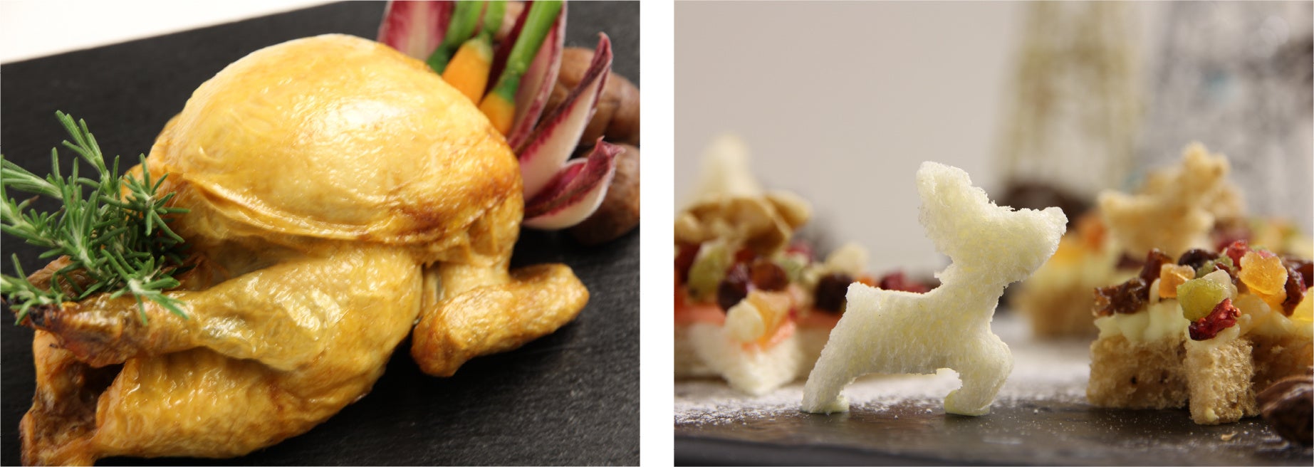 生ハムとカラフルトマトのカプレーゼ風 リッコタチーズのスノースタイル / ナッツとドライフルーツのカナッペ / シーフードのクリスマスリーフ 仕立て / カマンベールチーズと林檎のサンド / サンドウィッチセレクション / 冬野菜のスパニッシュオムレツ / マンハッタンクラムチャウダー / ブイヤベース/ビーフの煮込み ブルーギニョン風 / ハーブチキンのロースト / 苺の生クリームケーキ / ノエルショコラ / シュトーレン / パリブレスト / 抹茶のオペラ / 苺のタルト / トナカイクッキー、ツリー / ブッシュドノエル / 苺のゼリー / パンナコッタ