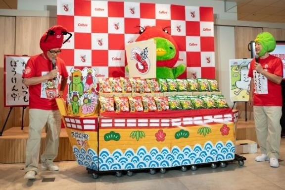 発表会の終盤には、「わたしのやめとま2025キャンペーン」第2弾告知のため、「かっぱえびせん」 ブランドキャラクター「かっぱえびくん」が登場。「かっぱえびくん」から耳元で伝言されるも「言葉が分からない!」という飯尾さんに代わり、司会より告知を行いました。さらに、豊永さんがデザインを手がけた宝船「かっぱえび船」も披露。“60年以上親しまれてきた「かっぱえびせん」にまつわる思い出などの宝物が詰まった船”という、作品に込められた想いを発表しました。
