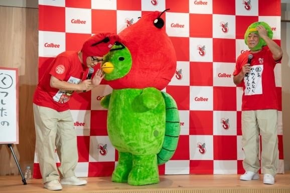 2025年7月29日(火)、カルビー本社にて「やめとまかるた 最優秀作品決定&のりしお味発売」記者発表会を開催しました。当日は、最優秀作品を選ぶ審査員長として、お笑いコンビ・ずんの飯尾 和樹さんとやすさんが登壇。お二人は、「やめとまかるた」の「あ」の読み札「ああ、やめられない、とまらない♪」をあしらったオリジナルTシャツと被り物姿で登場し、会場を和ませました。