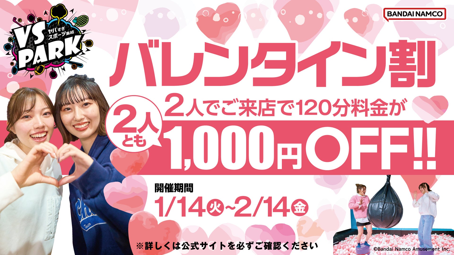株式会社バンダイナムコアミューズメントが運営する屋内“ヤバすぎ”アクティビティ施設『VS PARK』では、2025年1月14日(火)から2月14日(金)までの期間、誰でも2人で来店すると、120分料金が1人あたり1,000円引きになる「バレンタイン割」キャンペーンを開催します。友だち同士でも、親子でも、カップルでも、2人ならそれぞれ1,000円引きで利用できます。
