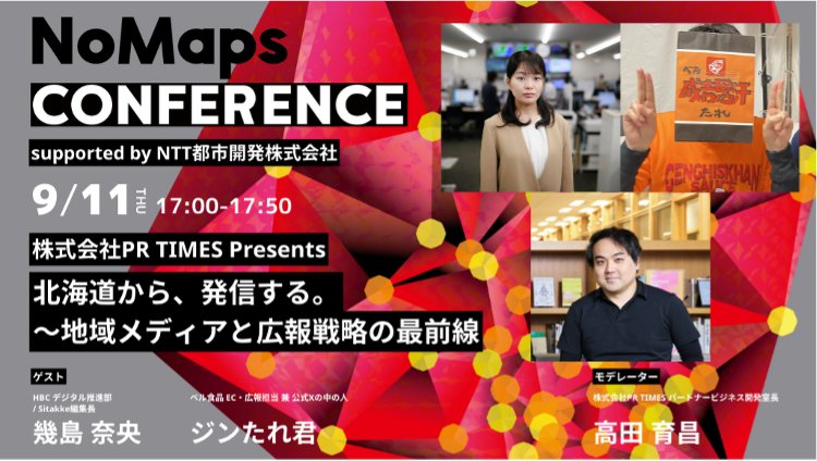 また、PR TIMESはこれまで札幌商工会議所などと連携し、北海道の事業者や自治体向けに広報・PRの理解を深めるセミナーの開催を重ねてきたほか、外部団体が主催するイベントで協賛・登壇協力してまいりました。直近では、札幌市を中心に毎年開催されている都市型複合フェスティバルで、昨年で10回目を迎えた「NoMaps2025」において、PR TIMESが9月11日に初めてカンファレンスを実施し、多くの企業・団体関係者の方に参加いただきました。
