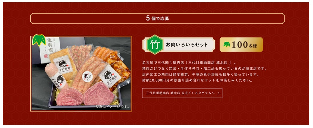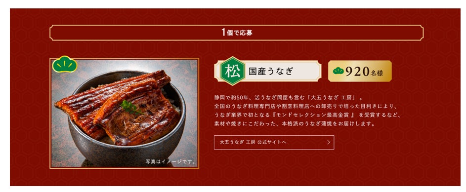① 応募期間内に対象商品を松コースであれば1個以上、竹コースであれば5個以上、梅沢コースであれば