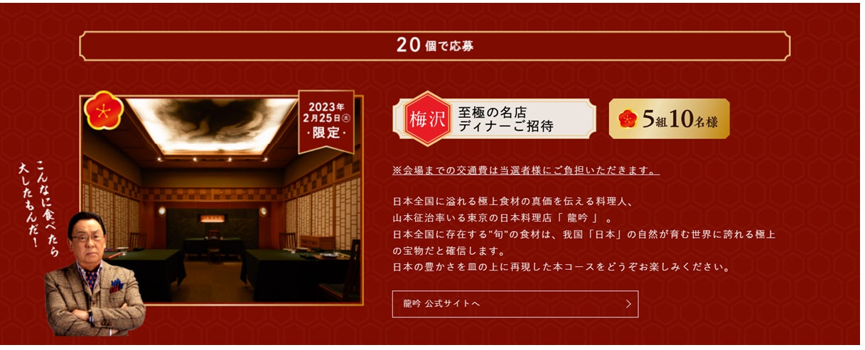 ① 「飲み干す一杯」シリーズCMキャラクターの梅沢富美男さんが実際にお買い求めになっている「三代目重助商店 城北店」のお肉をはじめ、モンドセレクション最高金賞を受賞したうなぎ店が提供する国産うなぎ、そして東京ミッドタウン日比谷に居をかまえ、日本の豊かな旬の食材を使った季節の恵みを堪能できる日本料理の名店「龍吟」のコースディナーご招待といった、豪華な景品ラインナップ!