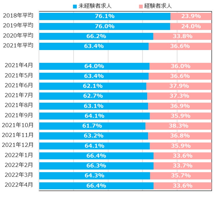 4月の正社員求人数は、2018年平均を100%とすると、2022年に入り120~130%の水準で推移している。また掲載求人の募集比率は、未経験者求人が66.4%、経験者求人が33.6%と、引き続きコロナ前より経験者求人比率が高めの傾向で推移している。【図4、5】