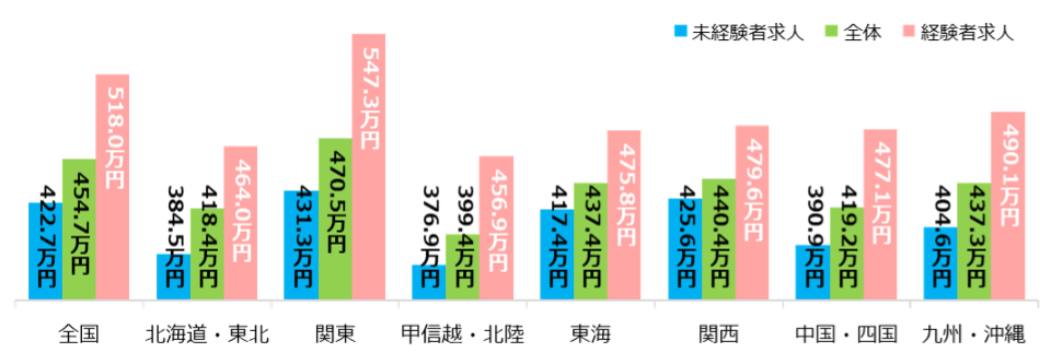 エリア別での4月の平均初年度年収は、「関東」が最も高く470.5万円、次いで「関西」が440.4万円、「東海」が437.4万円と続いた。「関東」の経験者求人の初年度年収は547.3万円と、最も低い「甲信越・北陸」の456.9万円と比較すると90万円以上の差が出た。【図3】