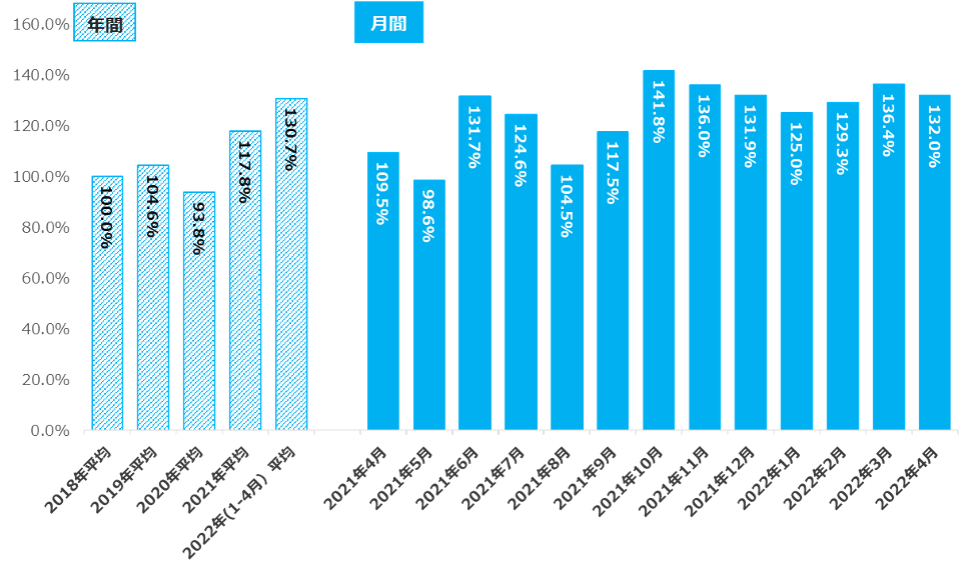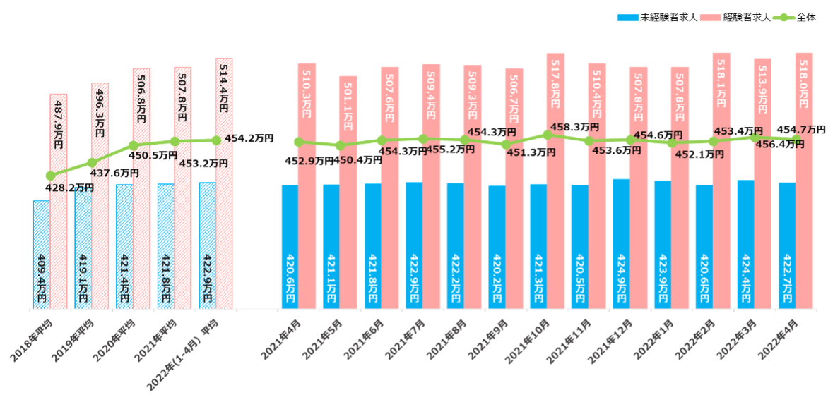 2022年4月の正社員の初年度年収は454.7万円(未経験者求人:422.7万円、経験者求人:518.0万円)。年間平均は2018年以降増加し続けているが、2022年に入り特に経験者求人の年収が増加している。【図1】