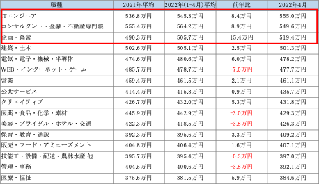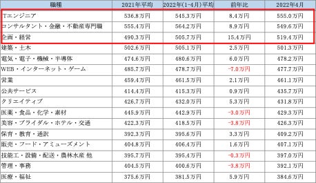 前年平均と比較し2022年(1-4月)平均の増加額が高かったのも同3職種で、企業の高度専門職人材への採用ニーズが2022年に入りさらに高まり、経験者求人の初年度年収の引上げを牽引していることがうかがえる。【図2】