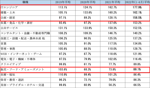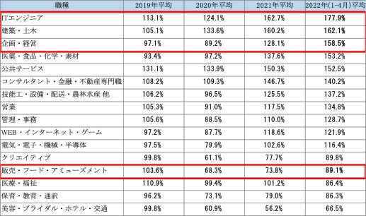 2022年(1-4月)平均で求人数が最も伸びている職種は「ITエンジニア」で177.9%、次いで「建築・土木」で162.1%、「企画・経営」で158.5%と続いた。コロナの影響が大きかった飲食関連の職種「販売・フード・アミューズメント」も2022年(1-4月)平均ではコロナ前の約9割の求人数まで回復した。【図6】