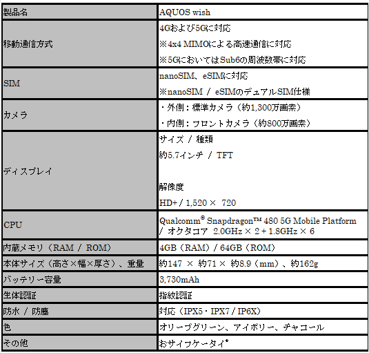 「AQUOS wish」は、約5.7インチのディスプレイを搭載し、ボタンや指紋センサ―が側面にまとまったシンプルなデザインです。また、持ち心地のよさを追求し、優しい手触りのマットな質感や、指がかりのよい側面形状を併せ持つほか、自然をモチーフにしたカラーバリエーションを展開しています。さらに、本体の筐体に再生プラスチック材を35%使用し、紙の使用量を削減した薄型の個装箱を採用するなど環境にも配慮された製品です。このほか、防水(IPX5・IPX7)・防塵(IP6X)機能や耐衝撃機能、指紋認証による生体認証、おサイフケータイ(R)を搭載するとともに、決済アプリなどを瞬時に起動する「AQUOS」スマートフォン独自機能「Payトリガー」にも対応し、便利な機能を多数搭載しています(注3、4)。なお、本製品はnanoSIMとeSIMに対応したデュアルSIM仕様のSIMロックフリー製品です。