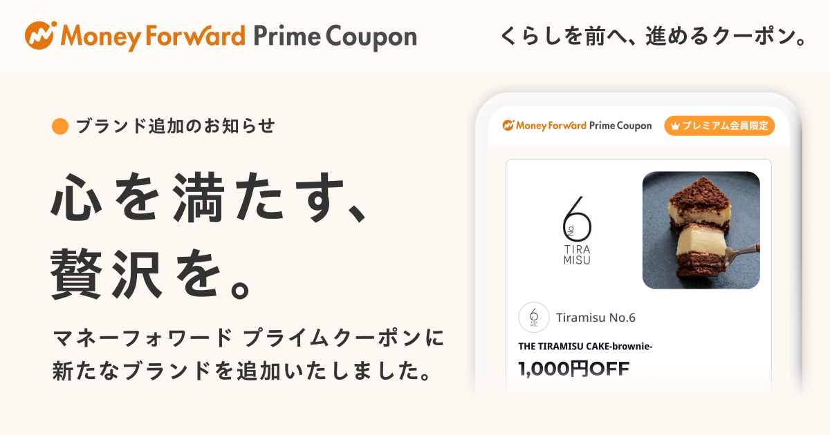 マネーフォワードホーム株式会社は、お金の見える化サービス『マネーフォワード ME』プレミアム会員限定「Prime Coupon(プライムクーポン)」において、本日2026年4月24日(金)より新たなクーポンを提供開始します。「心を満たす、贅沢を。」をテーマに、ティラミス専門店「Tiramisu No.6(ティラミスナンバーシックス)」を新たな提携ブランドとして迎えました。