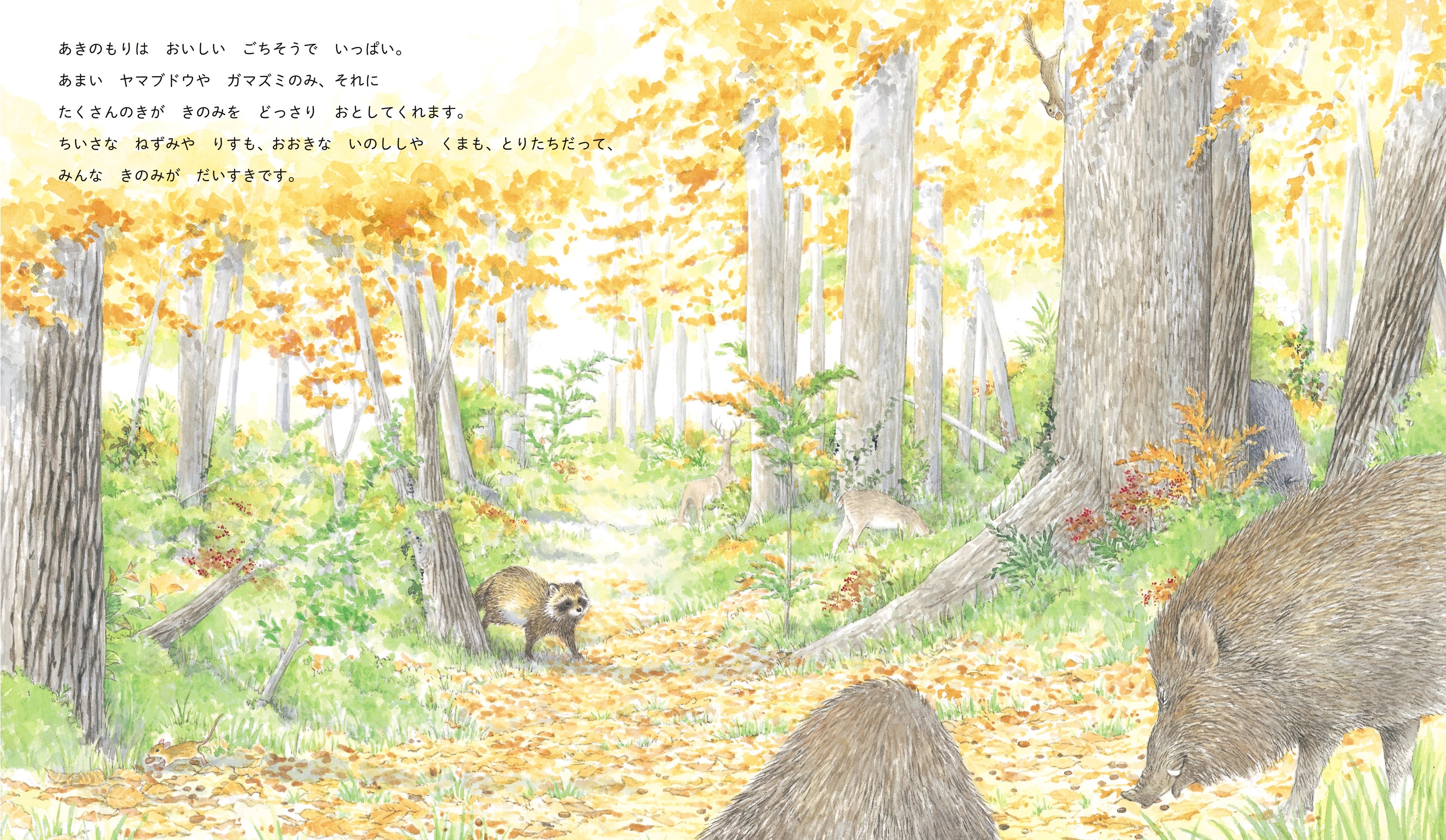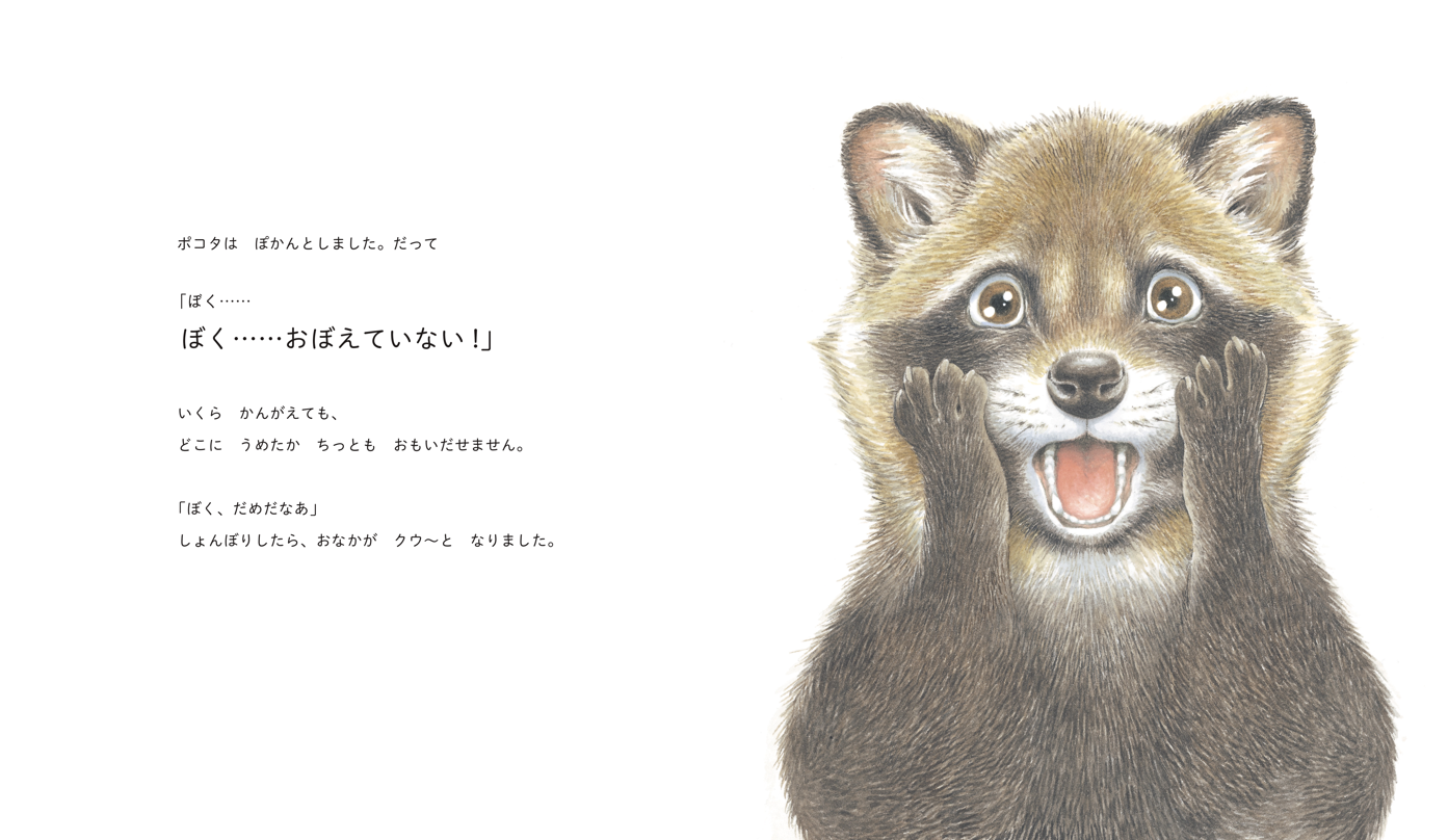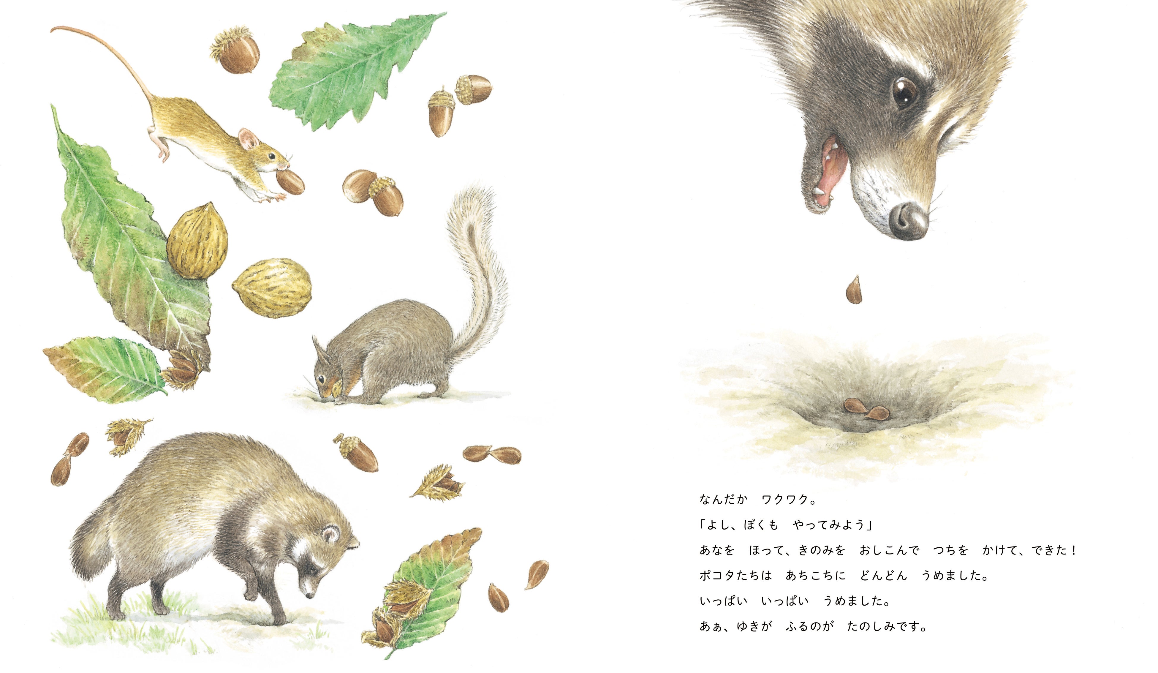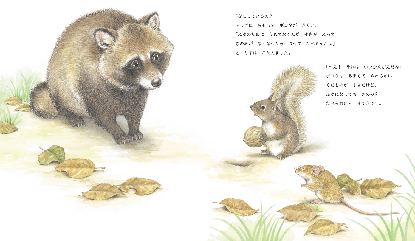 実りの秋。食いしん坊たぬきのポコタは、この頃食べても食べてもおなかがクウクウなります。ポコタは、りすやねずみが冬に備えて木の実を埋めていることを知り、真似をしようとしますが……。たぬきやりすの生態をベースにした、動物たちが生き抜くための冬支度の物語。 “ポコタもりすも、ねずみも、みんなそれぞれ得意なことがある”―個を認め合うやさしさを、しもかわらゆみが美しい水彩で描きます。