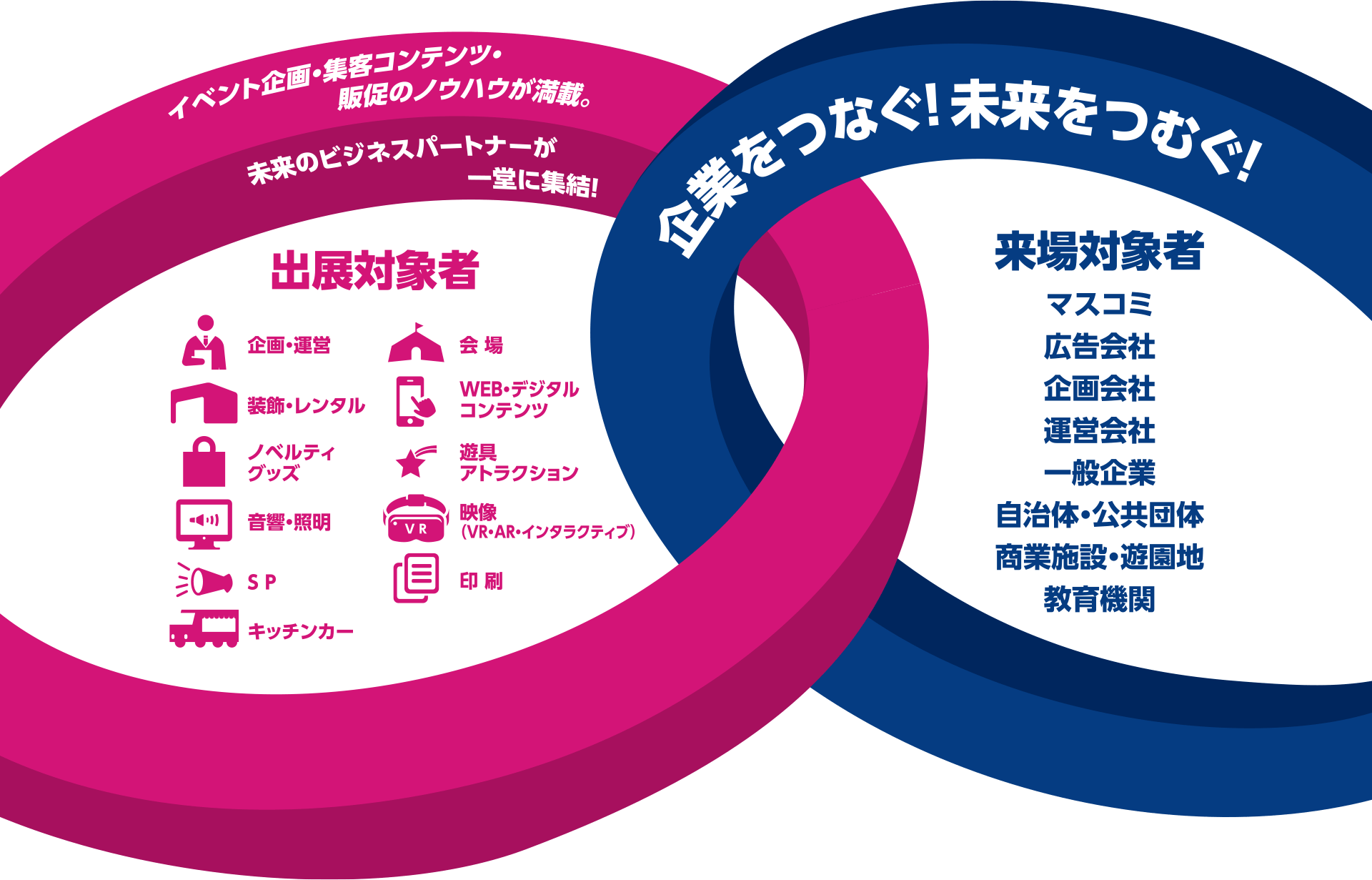アトラクションなどの集客ツール企業をはじめ、施⼯・レンタル・販促グッズ・装飾・⾳響・デジタルサイネージなど多数の関連企業が出展します。