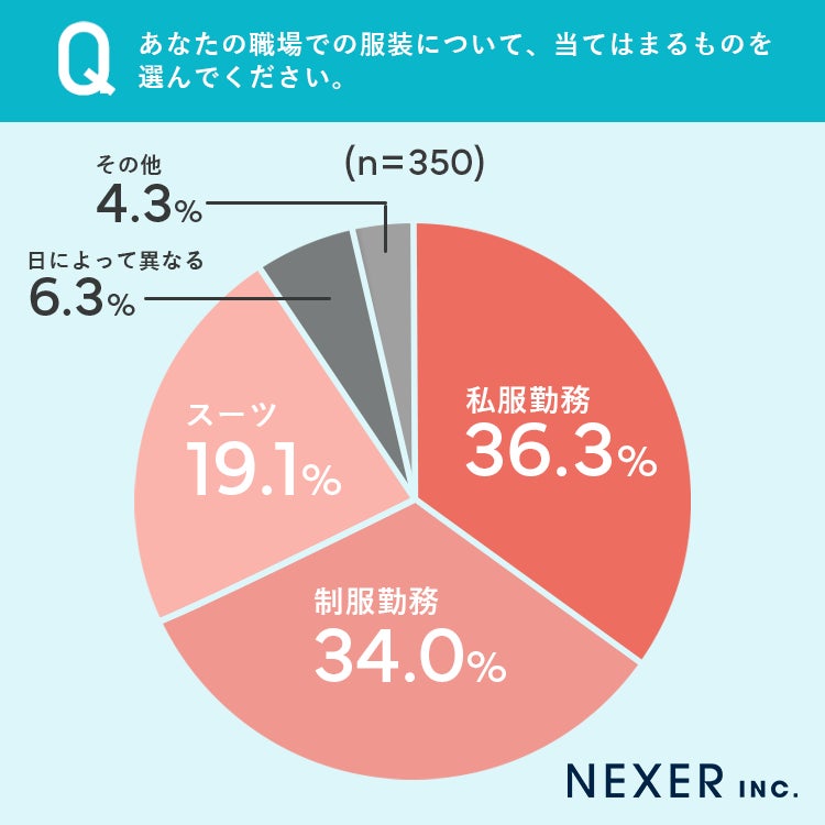 「私服勤務」が36.3%、「制服勤務」が34%、「スーツ」が19.1%という結果になりました。