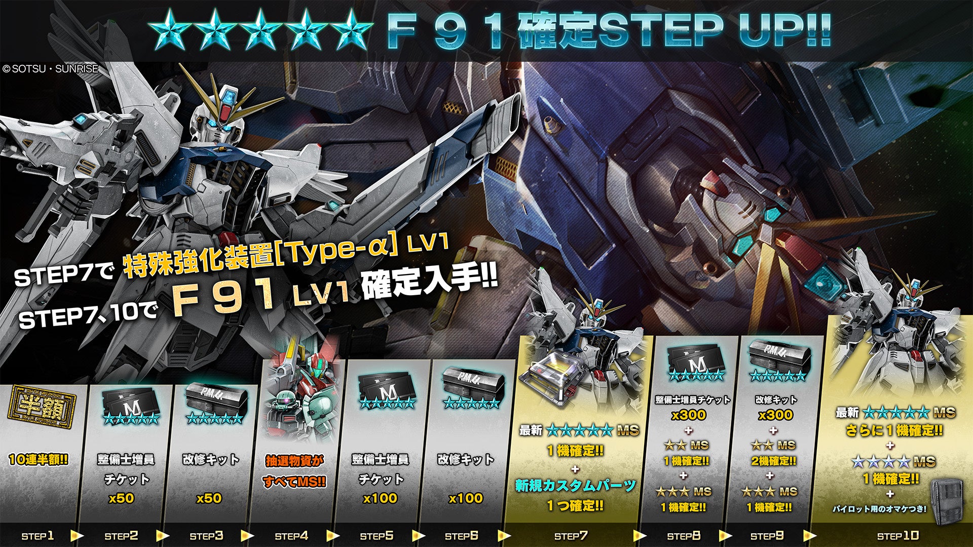 STEP10では「F91 LV1」がもう1機確定に加えて、★4MSも1機確定で手に入るお得な抽選配給に