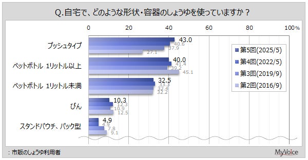 市販のしょうゆ利用者が使っているしょうゆの形状・容器は(複数回答)、「プッシュタイプ」が43.0%で過去調査と比べて増加傾向です。以下、「ペットボトル 1リットル以上」が40.0%、「ペットボトル1リットル未満」が32.5%で続きます。