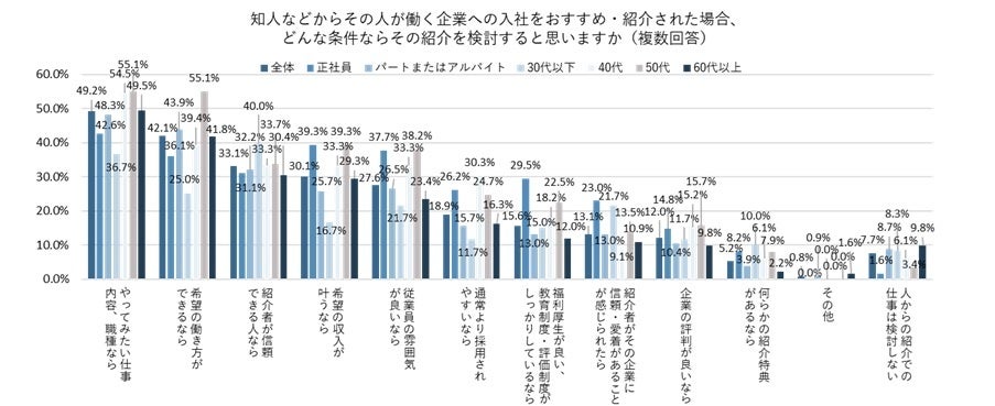 年代別にみると、いずれの年代でも「紹介相手が信頼できる人なら」が上位3項目以内に上がってきていた。勤め先企業に知り合いを紹介するとなった場合、紹介者は「企業にとって問題のある人ではないか」「紹介することで自分の評価に悪い影響を及ぼさないか」といった、勤め先からの視線を気にしているのではないだろうか。社員紹介制度を、人と企業を仲介する橋渡しの意味だけでなく、人柄や能力の適性をみて推薦する、という意味を含んで捉えている人も一定数いるようだ。