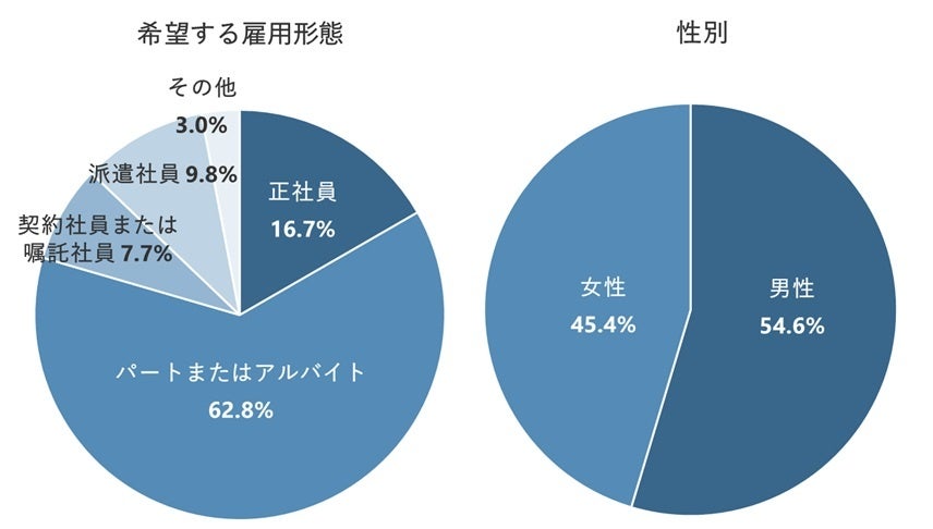 一方、「女性」のほうが「男性」よりも「生活との両立を図りたいから」が17.0pt、 「扶養の範囲内で働きたいから」が13.5pt高くなった。現在の生活を大切にできる形での仕事探しを進めている傾向がある。