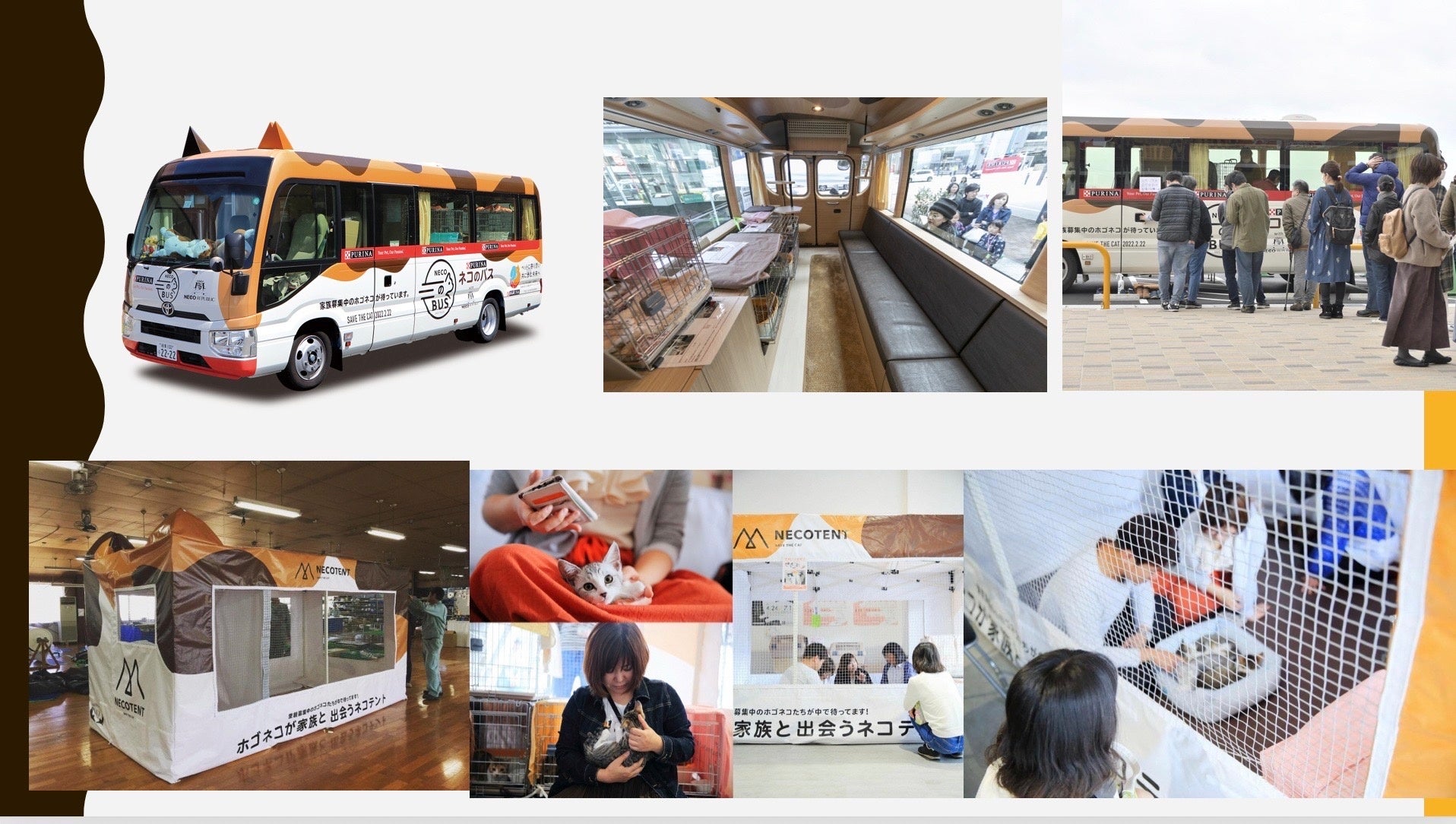 保護猫たちが運命の家族と出会うピュリナ「ネコのバス」と、譲渡会のために作られたネコテントが登場。