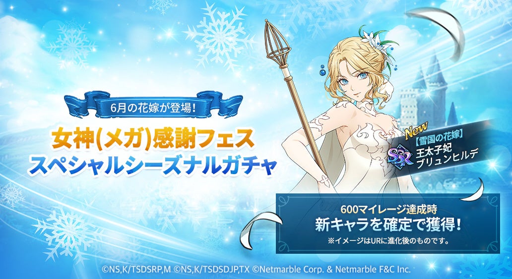 新キャラの出現率がアップする女神(メガ)感謝フェス第2弾 スペシャルシーズナルガチャからは、新シーズナルキャラ【雪国の花嫁】王太子妃 ブリュンヒルデが、ピックアップキャラとして登場いたします。