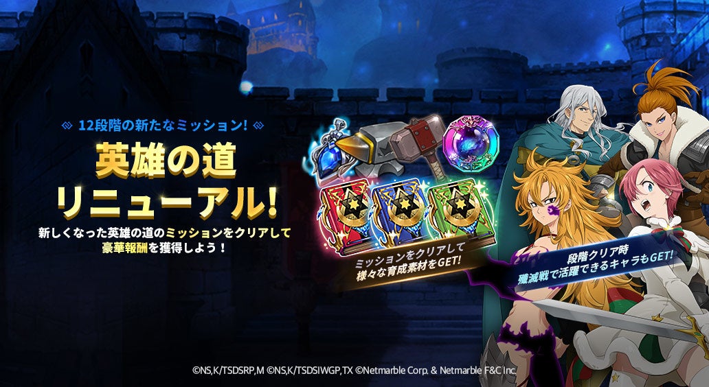 クエスト数の増加や難易度の調整に加え、報酬として『グラクロ』の最重要コンテンツ「殲滅戦」で役に立つSSRキャラをURランクLv.80フル覚醒状態で最大12体獲得できるようにした他、キャラ育成素材を大量に入手できるようにしました。