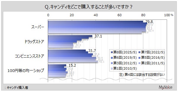 【キャンディに関する調査】キャンディ購入者のうち、「スーパー」で購入する人が8割、「ドラッグストア」「コンビニ」が各30%台。過去調査と比べて「ドラッグストア」は増加、「コンビニ」は減少傾向