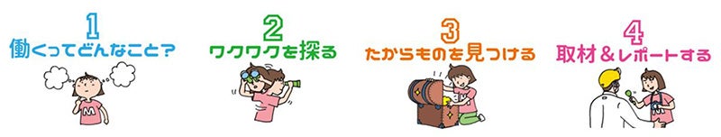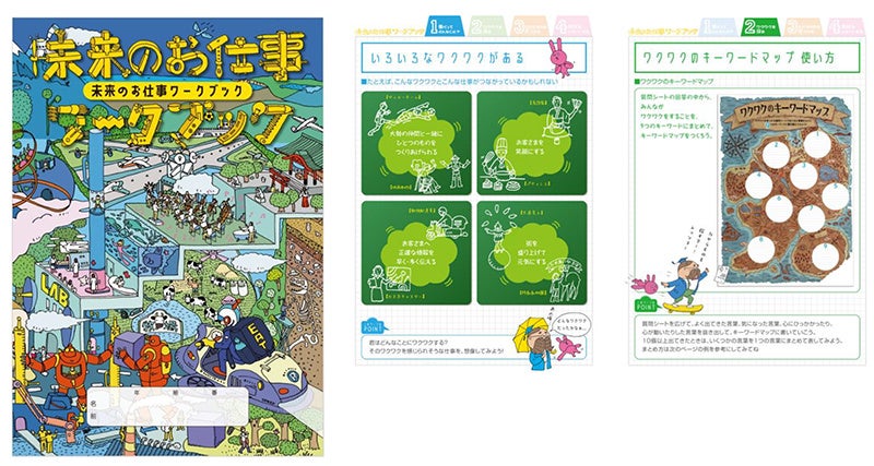 子ども向け冊子『未来のお仕事ワークブック』は全4章で構成されており、第1章では「働くこと」や「仕事」について学びます。第2章では、質問形式のワークに答えながら子どもたち自身の「ワクワク」を探り、幾つかのキーワードを抽出して「ワクワクのキーワードマップ」を作成。第3章では、第2章で作成した「ワクワクのキーワードマップ」を基に文章を組み立て、自分にとって「たからもの」のように大切にしたいことは何かを考えます。最後に、第4章では働く大人への取材を通じて、仕事における「ワクワク」について学び、レポ―ト形式でまとめます。